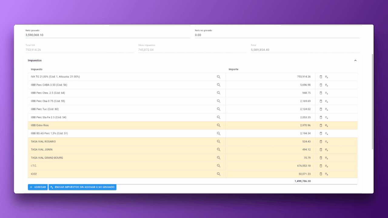 Los impuestos que no están correctamente asignados se destacan con un fondo amarillo claro en la grilla de Impuestos del comprobante.